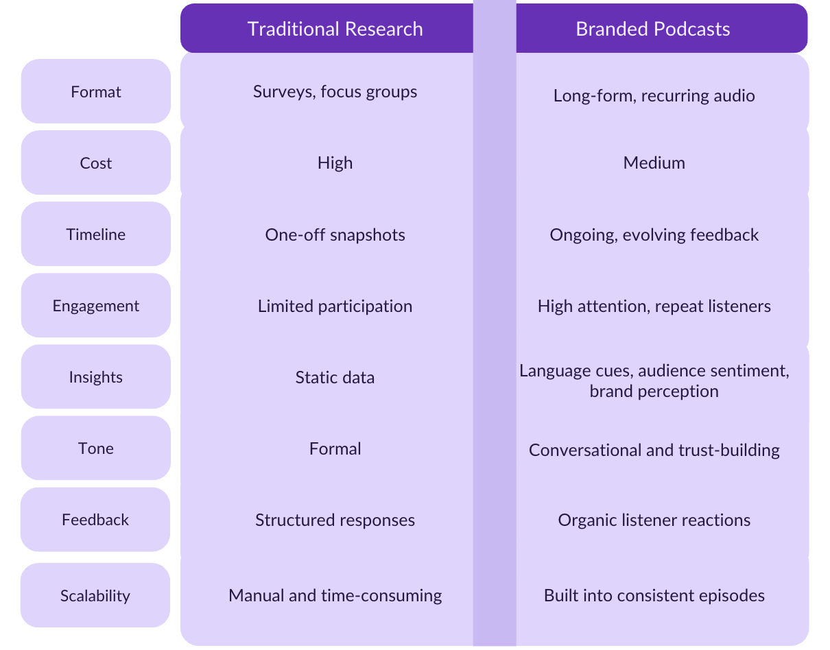 Branded podcasts are uniquely positioned to deliver always-on, authentic, and audience-driven insights that can inform everything from messaging to product direction.