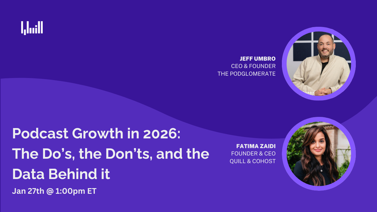 In this webinar, Fatima Zaidi, Founder & CEO of Quill and CoHost, and Jeff Umbro, CEO & Founder of The Podglomerate, will unpack the smart, data-driven approaches to growing your podcast audience in 2026. They’ll show you how to reach the listeners who matter, keep them engaged, and turn casual fans into loyal fans. Â
